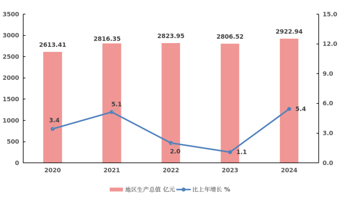 初步核算,全年实现地区生产总值[2][3]2922.94亿元,比上年增长5.4%。其中,第一产业增加值375.63亿元,增长3.8%;第二产业增加值1244.70亿元,增长5.2%;第三产业增加值1302.61亿元,增长6.1%。第一产业增加值占地区生产总值的比重为12.9%,第二产业增加值比重为42.6%,第三产业增加值比重为44.6%。全年人均地区生产总值120583元,比上年增长6.2%。