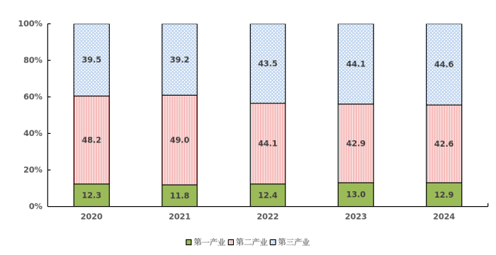 图2 2020-2024年三次产业增加值占地区生产总值比重