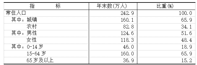 年末全市常住人口242.9万人,比上年末减少2.6万人。其中,城镇常住人口160.07万人,占总人口比重(常住人口城镇化率)为65.90%,比上年末提高1.51个百分点。全年常住人口出生率为6.14‰,人口死亡率为8.19‰,自然增长率为-2.05‰。年末全市户籍总户数80.76万户,户籍人口数为284.38万人,比上年末减少1.23万人。