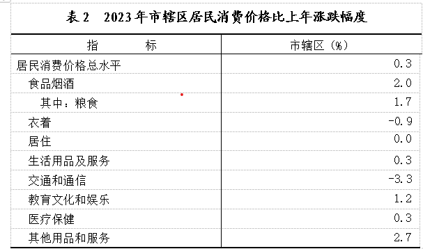 全年市辖区居民消费价格比上年上涨0.3%,其中食品烟酒价格上涨2.0%。