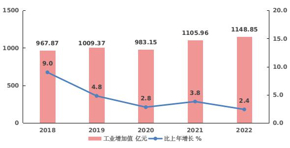 全年全部工业增加值1148.85亿元,比上年增长2.4%。规模工业增加值增长3.3%。在规模工业中,分经济类型看,国有控股企业增长5.2%;国有企业增长3.3%,集体企业增长12.8%,股份合作企业增长5.5%,股份制企业增长3.4%,外商及港澳台商投资企业下降4.9%;其他企业下降1.2%。分轻重看,轻工业同比下降0.7%,重工业增长5.1%。分门类看,采矿业下降6.0%,制造业增长4.7%,电力、热力、燃气及水生产和供应业下降5.2%。工业产品销售率97.76%,比上年下降0.62个百分点。
