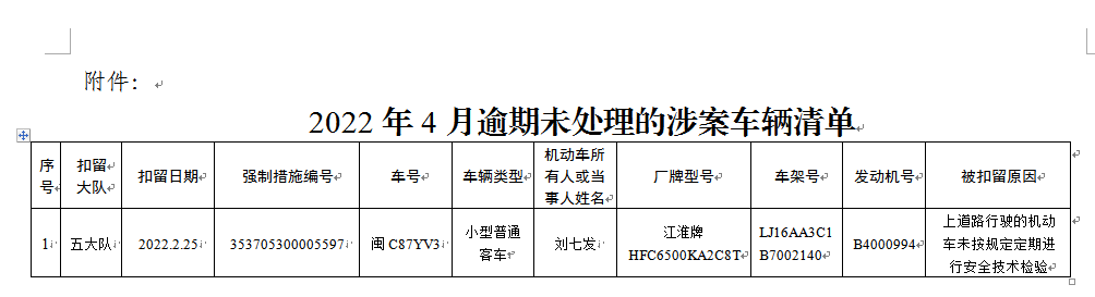 下列1辆机动车因交通违法被我队下属大队扣留,当事人未提供合法证明、补办相应手续,或逾期未前来接受处理,根据《中华人民共和国道路交通安全法》第一百一十二条第三款和《中华人民共和国道路交通安全法实施条例》第一百零七条之规定,请当事人自本公告发布之日起三个月内到相关大队接受处理,自公告之日起三个月仍不来接受处理的,我队将对扣留的车辆依法处理。