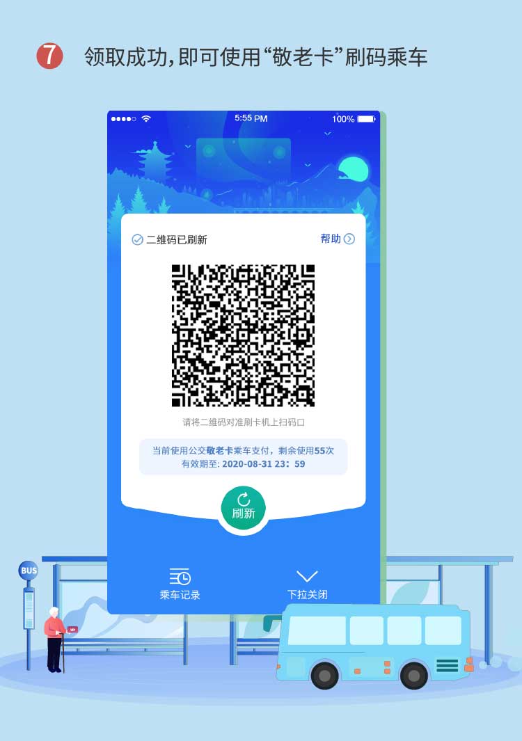 2.老年人乘车时请自觉遵守乘车规则,上车主动刷卡或扫码,听到刷卡机提示声音为“敬老卡”时,即扫码(刷卡)成功。
