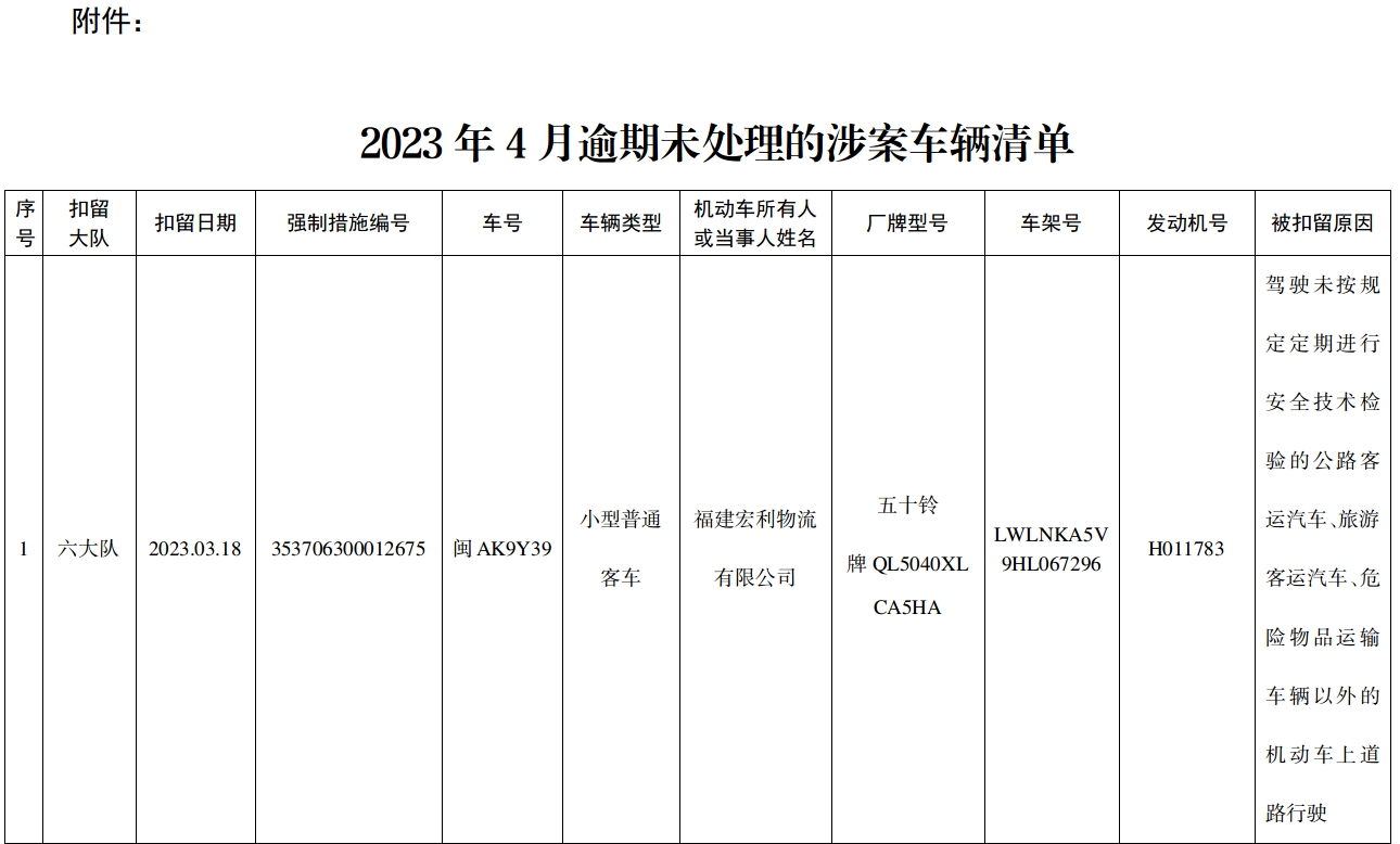 附件:2023年4月逾期未处理的涉案车辆清单