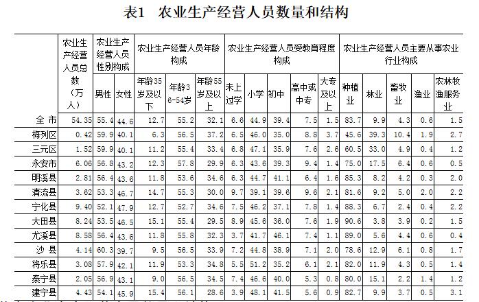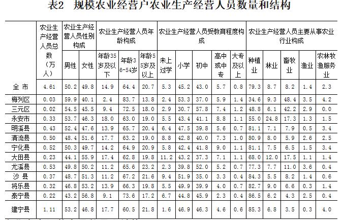2016年,规模农业经营户农业生产经营人员(包括本户生产经营人员及雇佣人员)4.61万人,其中女性2.30万人,年龄35岁及以下的0.69万人,年龄在36至54岁之间的2.97万人,年龄55岁及以上的0.96万人。