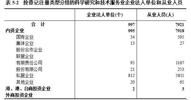 在科学研究和技术服务业企业法人单位中,内资企业占99.8%,港、澳、台商投资企业占0.2%。(详见表5-2)。