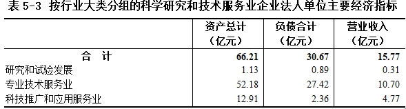 2018年末,科学研究和技术服务业企业法人单位资产总计66.21亿元,比2013年末增长81.0%。负债合计30.67亿元。全年实现营业收入15.77亿元(详见表5-3)。