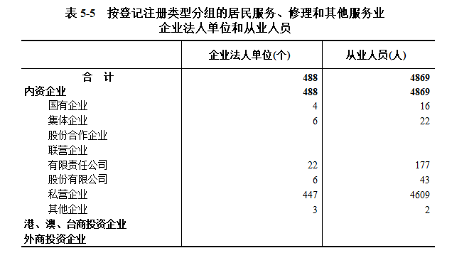 在居民服务、修理和其他服务业企业法人单位从业人员中,内资企业占100%(详见表5-5)。