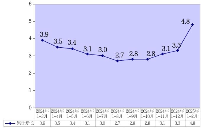 1-2月全市社会消费品零售总额同比增长4.8%,增幅较2024年和上年同期分别提高1.5个和0.9个百分点,位居全省第5位。