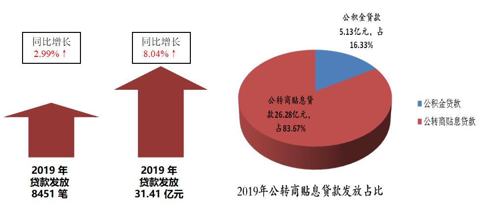 2019年发放住房公积金贷款(含公转商贴息贷款)8451笔、金额31.41亿元,分别同比增长2.99%、8.04%;其中公转商贴息贷款发放额占比83.67%。