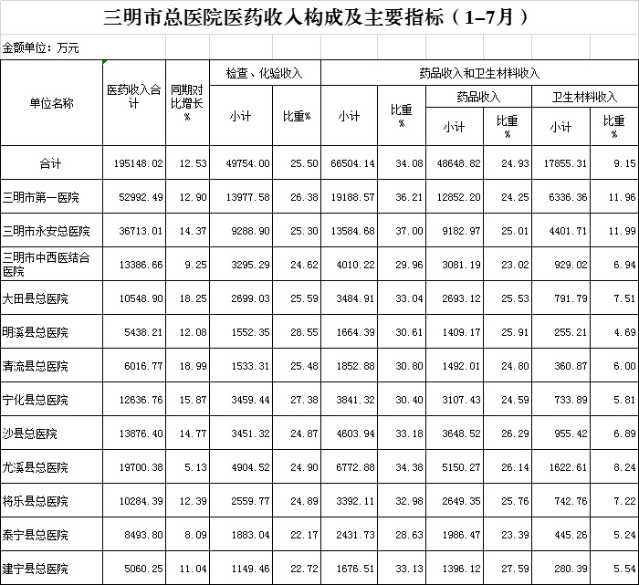 医药总收入。1-7月份12家总医院医药总收入同比增长12.53%(不含体检收入的医药收入同比增长12.75%),增长率超过考核要求(三级医院考核要求为12%,二级医院考核要求为10%)的有9家总医院,其中清流县总医院同比增长8.99%、大田县总医院8.25%、宁化县总医院同比增长5.87%。