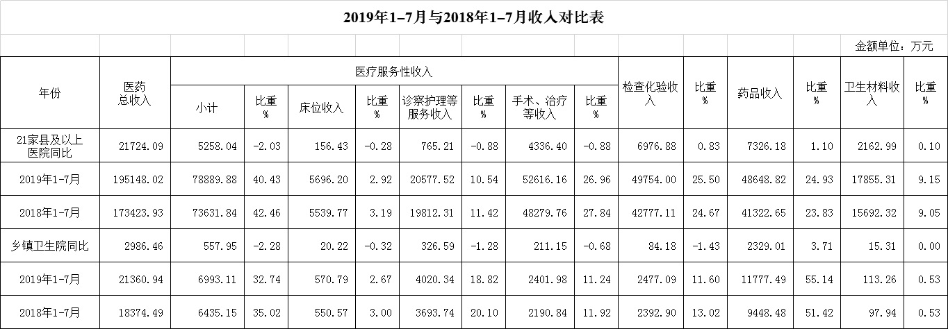 1.医药收入:7月份12家总医院医药总收入28302.46万元,比去年同期26070.08万元,增加2232.39万元,增长8.56%。其中:医疗服务性收入11687.10万元,占医药收入41.29%(床位收入793.40万元、手术治疗护理等服务收入10893.70万元),比去年同期11089.20万元, 医疗服务性收入增加597.90万元,增长5.39%;药品收入6699.87万元,比去年同期6065.89万元,增加633.97万元,增长10.45%。