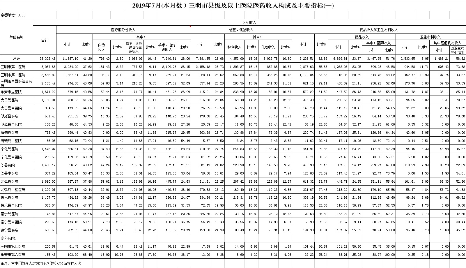 1-7月份基层医疗机构医药总收入21360.94万元(其中村所收入2679.92万元),去年同期18374.49万元,同比增加2986.46万元,增长16.25%,其中:医疗服务性收入6993.11万元,占医药收入32.74%(床位收入570.79万元、手术治疗护理等服务收入6422.32万元),去年同期6435.15万元, 医疗服务性收入同比增加557.95万元,增长8.67%;检查化验收入2477.09万元,同比增长3.52%;药品收入11777.49万元,去年同期9448.48万元,同比增加2329.01万元,增长24.65%,药占比55.14%,去年同期51.42%,同比增长3.71个百分点;卫生材料收入113.26万元,较去年同期97.94万元,同比增加15.31万元,占医药收入0.53%,较去年同期0.53%,同比下降0.00个百分点。入院人次64292人次,去年同期62721人次,同比增加1571人次,增长2.50%,其中将乐县、梅列区、尤溪县分别下降10.43%、8.38%、4.83%、;门急诊人次2743745人次(其中村所门急诊995414人次),去年同期2522230人次,同比增加221515人次,增长8.78%(基层诊疗量占比为41.48%,较去年同期的40.84%增长0.64个百分点);每门诊次均费用59.59元,去年同期54.12元,同比增加5.47元,增长10.11%;出院者平均费用781.60元,去年同期752.99元,同比增加28.61元,增长3.80%。