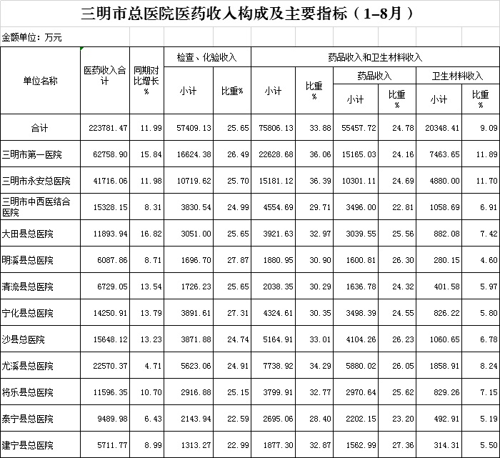 医药总收入。1-8月份12家总医院医药总收入同比增长11.99%(不含体检收入的医药收入同比增长11.97%),增长率超过考核要求(三级医院考核要求为12%,二级医院考核要求为10%)的有6家总医院,其中大田县总医院同比增长16.82%、博牛娱乐