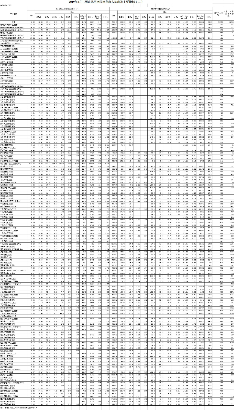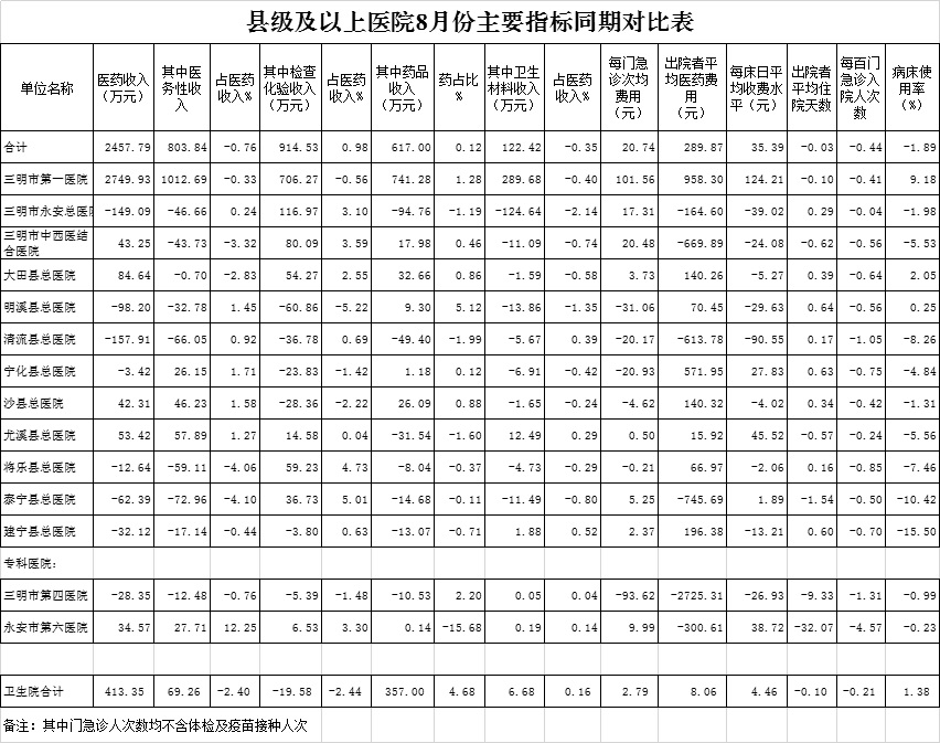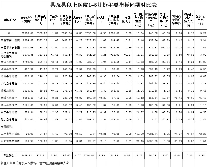 1-8月份基层医疗机构医药总收入24405.45万元(其中村所收入2989.07万元),去年同期20975.64万元,同比增加3429.81万元,增长16.35%,其中:医疗服务性收入7953.21万元,占医药收入32.59%(床位收入650.16万元、手术治疗护理等服务收入7303.05万元),去年同期7326.00万元, 医疗服务性收入同比增加627.21万元,增长8.56%;检查化验收入2796.81万元,同比增长2.36%;药品收入13523.33万元,去年同期10807.32万元,同比增加2716.01万元,增长25.13%,药占比55.41%,去年同期51.52%,同比增长3.89个百分点;卫生材料收入132.10万元,较去年同期110.11万元,同比增加21.99万元,占医药收入0.54%,较去年同期0.52%,同比增长0.02个百分点。入院人次72890人次,去年同期70989人次,同比增加1901人次,增长2.68%,其中梅列区、将乐县、尤溪县分别下降11.95%、9.77%、3.66%;门急诊人次3125698人次(其中村所门急诊1134979人次),去年同期2858488人次,同比增加267210人次,增长9.35%(基层诊疗量占比为41.19%,较去年同期的40.64%增长0.55个百分点);每门诊次均费用59.85元,去年同期54.59元,同比增加5.26元,增长9.63%;出院者平均费用783.18元,去年同期756.89元,同比增加26.28元,增长3.47%。