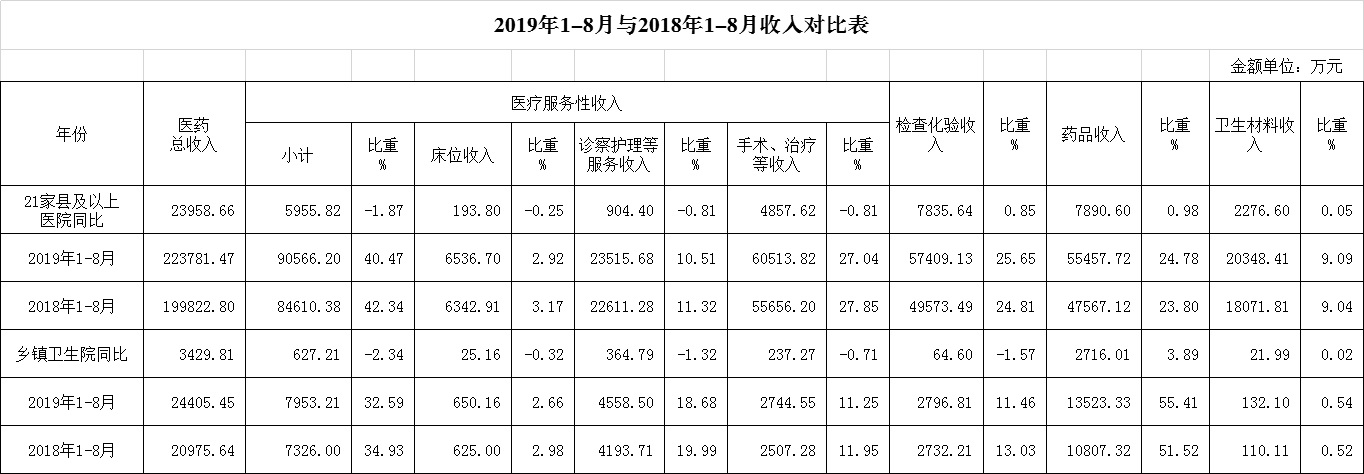 1.医药收入:8月份12家总医院医药总收入26823.33万元,比去年同期26398.88万元,增加424.45万元,增长1.61%。其中:医疗服务性收入10966.70万元,占医药收入40.88%(床位收入803.60万元、手术治疗护理等服务收入10163.10万元),比去年同期10978.54万元, 医疗服务性收入减少11.84万元,下降0.11%;药品收入6384.66万元,比去年同期6244.47万元,增加140.18万元,增长2.24%。
