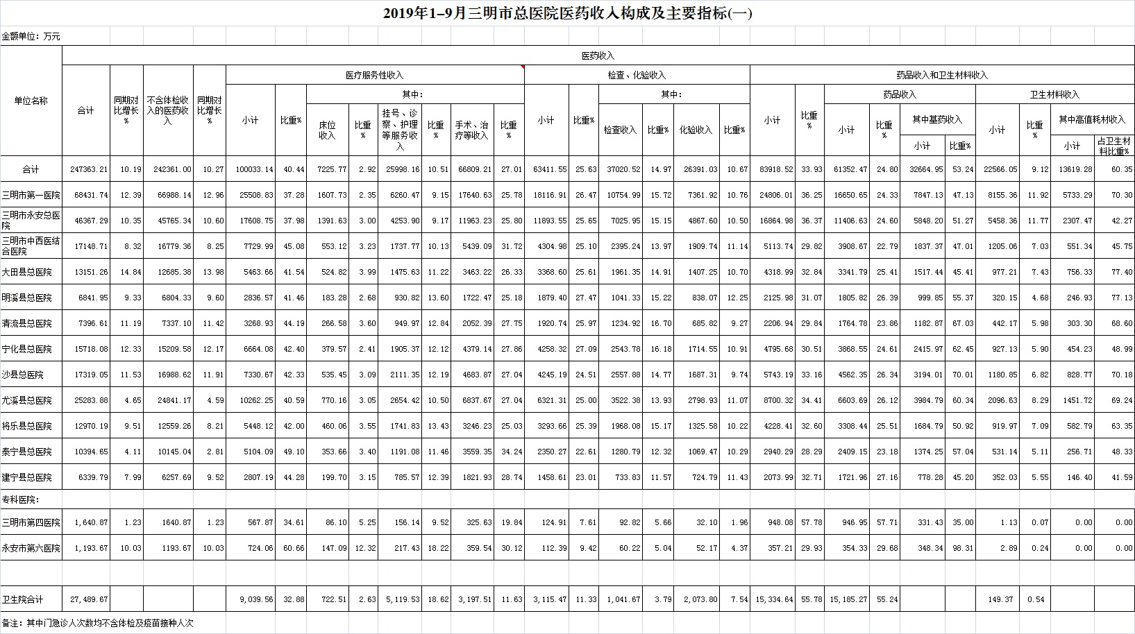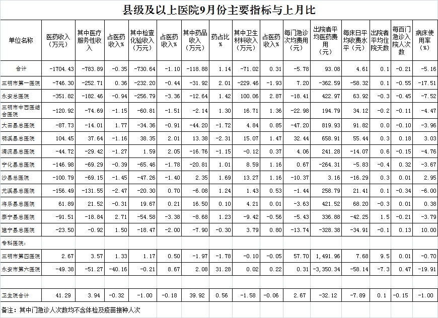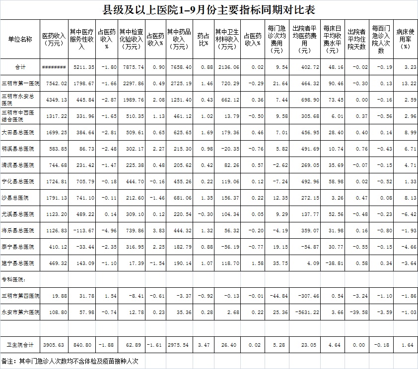 医药总收入。1-9月份12家总医院医药总收入同比增长10.19%(不含体检收入的医药收入同比增长10.27%),增长率超过考核要求(三级医院考核要求为12%,二级医院考核要求为10%)的有5家总医院,其中大田县总医院同比增长14.84%、宁化县总医院同比增长12.33%、沙县总医院同比增长11.53%。