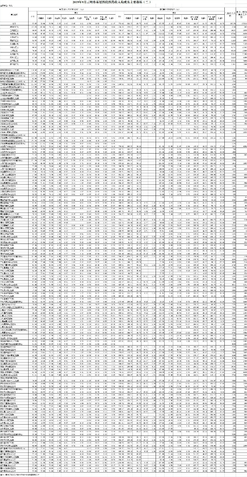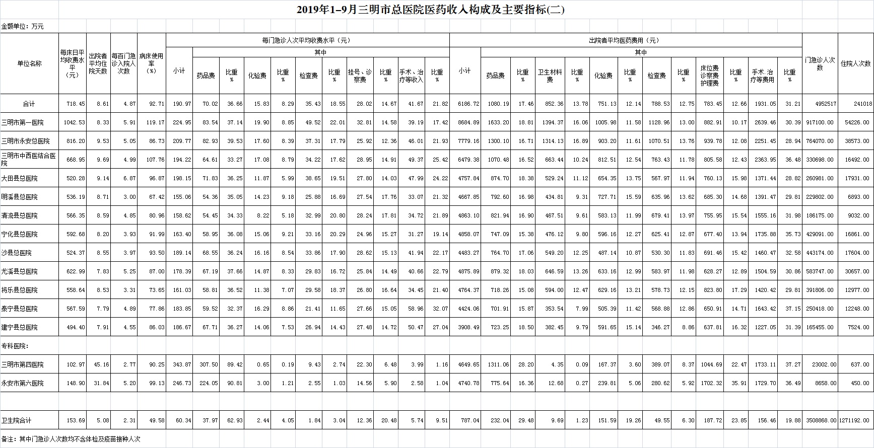 1-9月份基层医疗机构医药总收入27489.67万元(其中村所收入3286.29万元),去年同期23584.04万元,同比增加3905.63万元,增长16.56%,其中:医疗服务性收入9039.56万元,占医药收入32.88%(床位收入722.51万元、手术治疗护理等服务收入8317.05万元),去年同期8198.76万元, 医疗服务性收入同比增加840.80万元,增长10.26%;检查化验收入3115.47万元,同比增长2.06%;药品收入15185.27万元,去年同期12209.72万元,同比增加2975.54万元,增长24.37%,药占比55.24%,去年同期51.77%,同比增长3.47个百分点;卫生材料收入149.37万元,较去年同期122.97万元,同比增加26.40万元,占医药收入0.54%,较去年同期0.52%,同比增长0.02个百分点。入院人次80941人次,去年同期79255人次,同比增加1686人次,增长2.13%,其中梅列区、将乐县、泰宁县分别下降55.36%、9.67%、9.46%、;门急诊人次3508868人次(其中村所门急诊1271192人次),去年同期3191137人次,同比增加317731人次,增长9.96%(基层诊疗量占比为41.47%,较去年同期的40.54%增长0.93个百分点);每门诊次均费用60.34元,去年同期55.07元,同比增加5.27元,增长9.56%;出院者平均费用781.11元,去年同期758.06元,同比增加23.05元,增长3.04%。