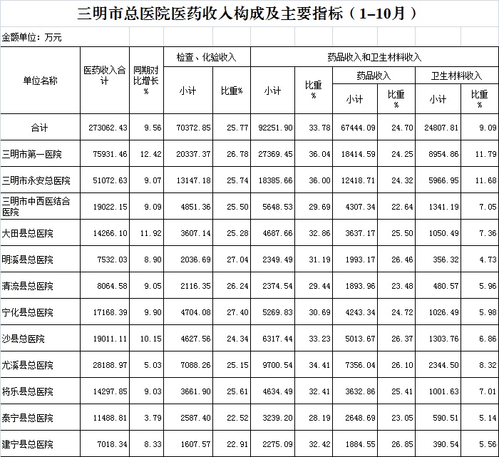 医药总收入。1-10月份12家总医院医药总收入同比增长9.56%(不含体检收入的医药收入同比增长9.55%),增长率超过考核要求(三级医院考核要求为12%,二级医院考核要求为10%)的有3家总医院,其中大田县总医院同比增长11.92%、博牛娱乐