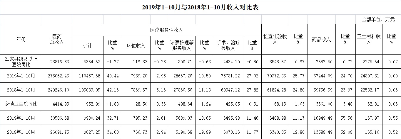1.医药收入:10月份12家总医院医药总收入25699.22万元,比去年同期24764.44万元,增加934.78万元,增长3.77%。其中:医疗服务性收入10404.54万元,占医药收入40.49%(床位收入763.43万元、手术治疗护理等服务收入9641.11万元),比去年同期10261.26万元, 医疗服务性收入增加143.28万元,增长1.40%;药品收入6091.62万元,比去年同期6062.52万元,增加29.10万元,增长0.48%。