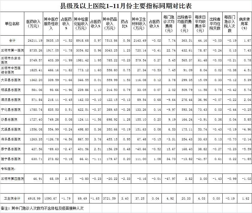 医药总收入。1-11月份12家总医院医药总收入同比增长8.79%(不含体检收入的医药收入同比增长8.76%),增长率超过考核要求(三级医院考核要求为12%,二级医院考核要求为10%)的有1家总医院,为宁化县总医院,同比增长10.45%。
