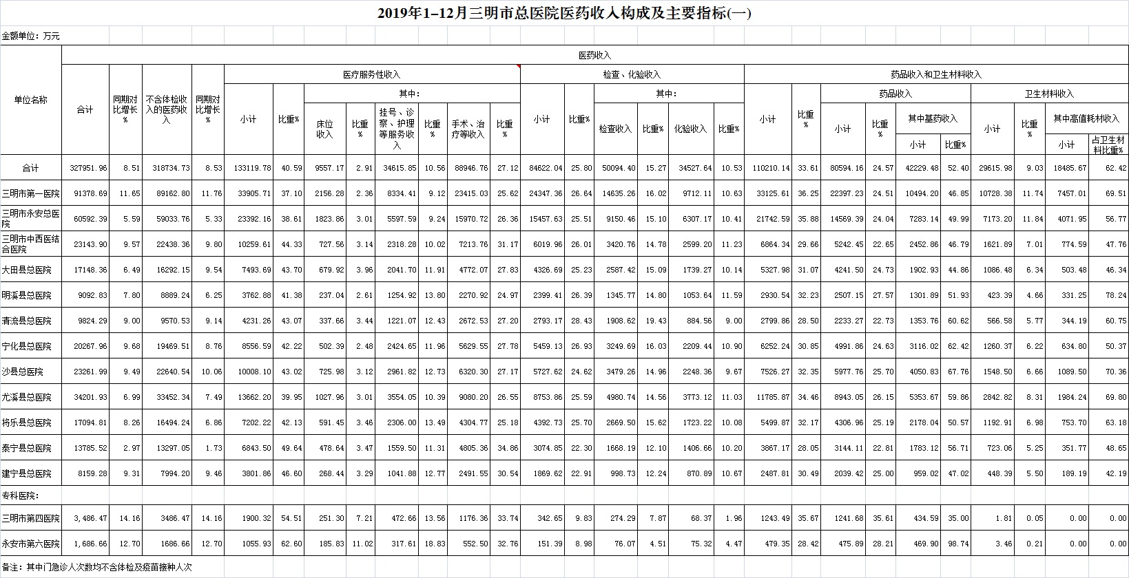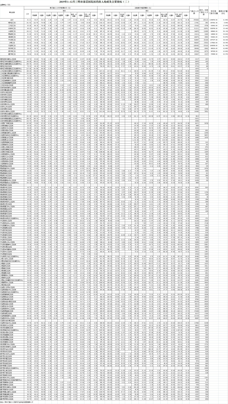 1-12月份基层医疗机构医药总收入37328.64万元(其中村所收入4755.14万元),去年同期31579.20万元,同比增加5749.45万元,增长18.21%,其中:医疗服务性收入12043.68万元,占医药收入32.26%(床位收入941.69万元、手术治疗护理等服务收入11101.99万元),去年同期10735.98万元, 医疗服务性收入同比增加1307.70万元,增长12.18%;检查化验收入4051.66万元,同比增长5.78%;药品收入21030.87万元,去年同期16853.86万元,同比增加4177.01万元,增长24.78%,药占比56.34%,去年同期53.37%,同比增长2.97个百分点;卫生材料收入202.43万元,较去年同期159.01万元,同比增加43.42万元,占医药收入0.54%,较去年同期0.50%,同比增长0.04个百分点。入院人次102800人次,去年同期97986人次,同比增加4814人次,增长4.91%,其中梅列区、将乐县、清流县分别下降19.2%、3.26%、2.64%、;门急诊人次4756076人次(其中村所门急诊1856656人次),去年同期4271290人次,同比增加484786人次,增长11.35%(基层诊疗量占比为41.86%,较去年同期的40.71%增长1.15个百分点);每门诊次均费用61.21元,去年同期56.13元,同比增加5.08元,增长9.05%;出院者平均费用799.51元,去年同期774.82元,同比增加24.69元,增长3.19%。