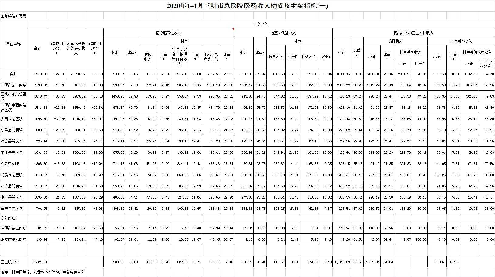 (一)1月份12家总医院运行情况:医药总收入23278.96万元,比去年同期29846.02万元减少6567.07万元,下降22.00%(不含体检收入的医药收入为22858.57万元,比去年同期下降22.18%)。