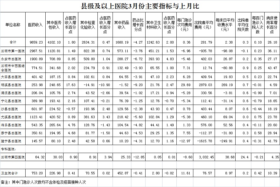 1-3月份基层医疗机构医药总收入9232.27万元(其中村所收入1215.69万元),去年同期9056.68万元,同比增加175.59万元,增长1.94%,其中:医疗服务性收入2669.94万元,占医药收入28.92%(床位收入152.56万元、手术治疗护理等服务收入2517.38万元),去年同期2946.09万元, 医疗服务性收入同比减少276.15万元,下降9.37%;检查化验收入845.01万元,同比下降18.67%;药品收入5674.86万元,去年同期5022.88万元,同比增加651.98万元,增长12.98%,药占比61.47%,去年同期55.46%,同比增长6.01个百分点;卫生材料收入42.46万元,较去年同期48.78万元,同比减少6.32万元,占医药收入0.46%,较去年同期0.54%,同比下降0.08个百分点。入院人次17811人次,去年同期26534人次,同比减少8723人次,下降32.87%,其中梅列区、明溪县、泰宁县分别下降58.27%、51.7%、47.9%、;门急诊人次1213594人次(其中村所门急诊446842人次),去年同期1203813人次,同比增加9781人次,增长0.81%(基层诊疗量占比为47.70%,较去年同期的42.02%增长5.68个百分点);每门诊次均费用64.53元,去年同期58.20元,同比增加6.34元,增长10.89%;出院者平均费用782.26元,去年同期779.65元,同比增加2.62元,增长0.34%。
