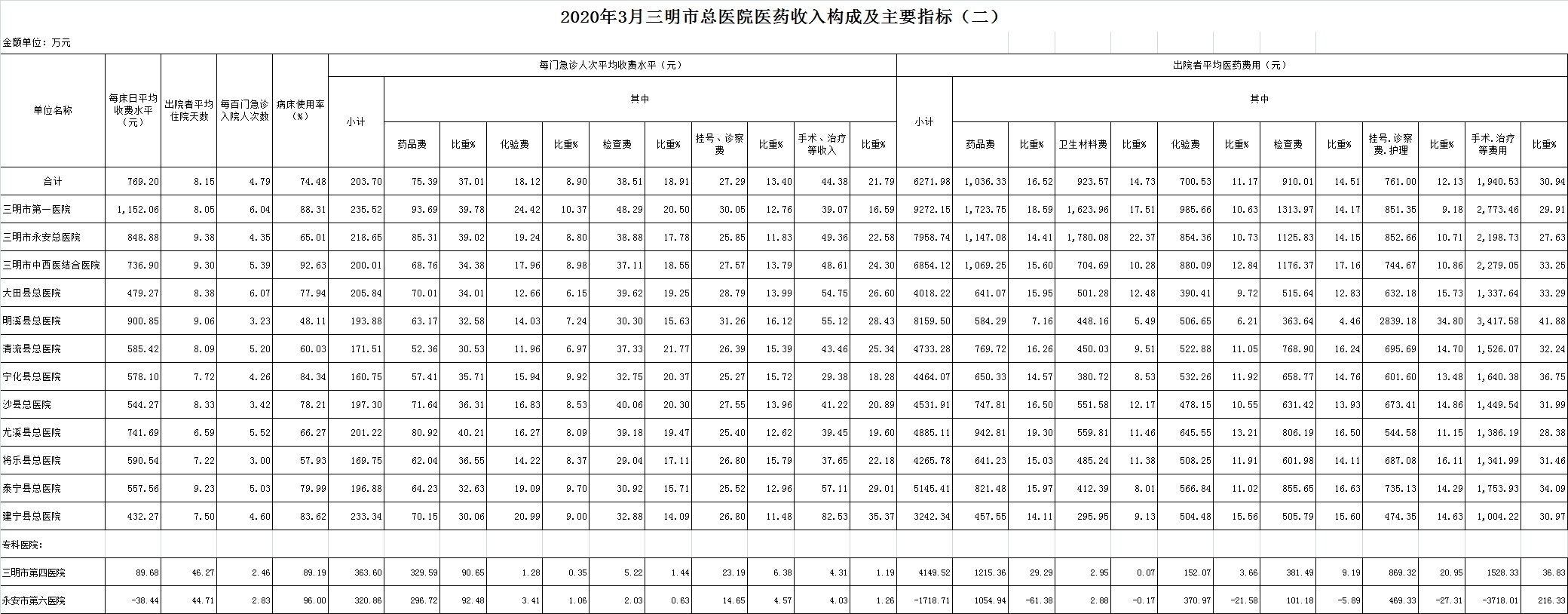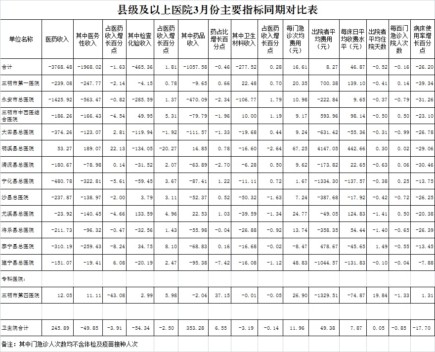 永安总医院36.67%、市中西医结合医院41.51%、大田县总医院44.66%、明溪县总医院50.73%、清流县总医院43.36%、宁化县总医院41.33%、沙县总医院40.73%、尤溪县总医院36.57%、将乐县总医院41.36%、泰宁县总医院43.56%、建宁县总医院42.49%,仅大田县、明溪县总医院完成考核指标。