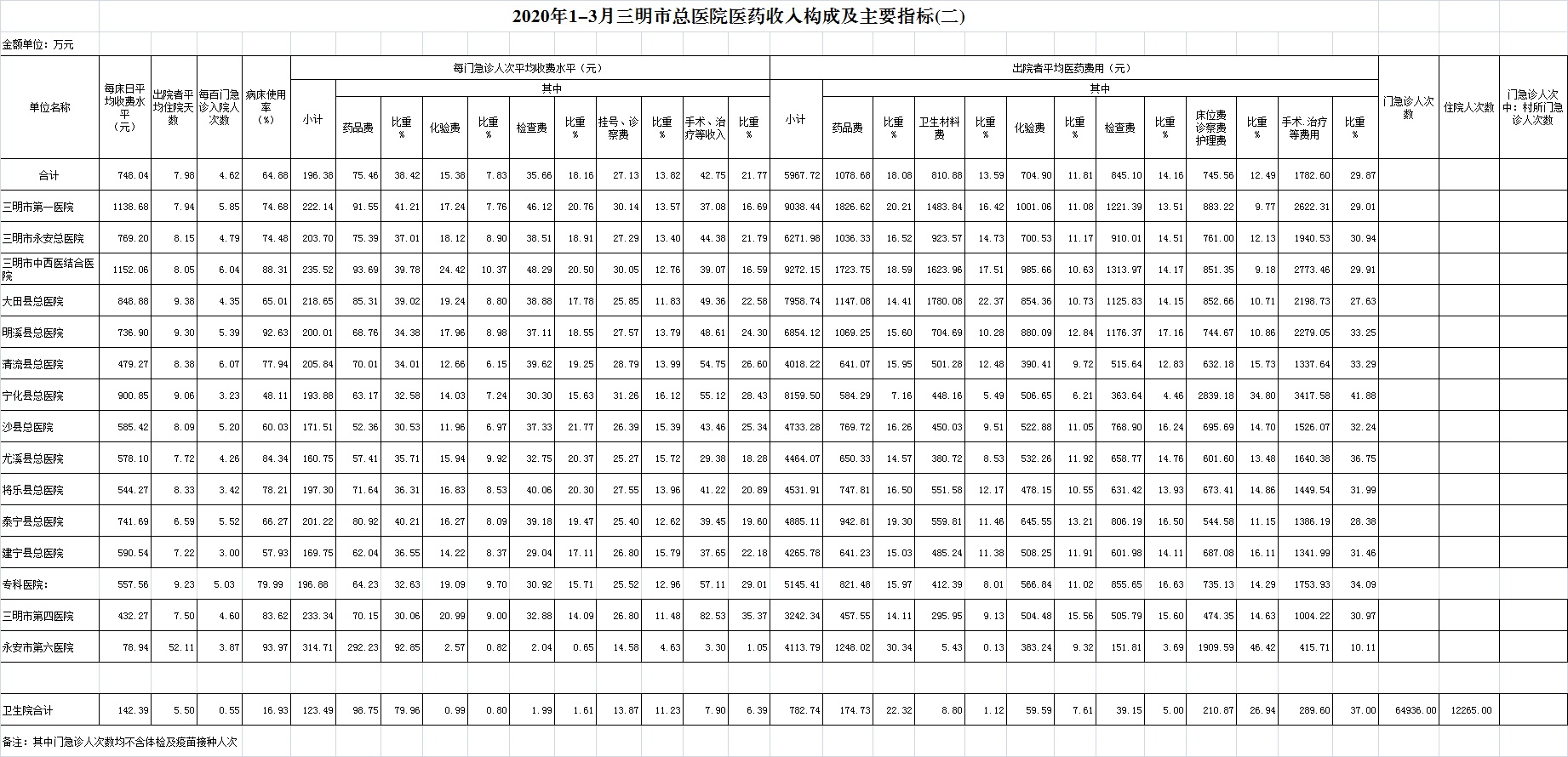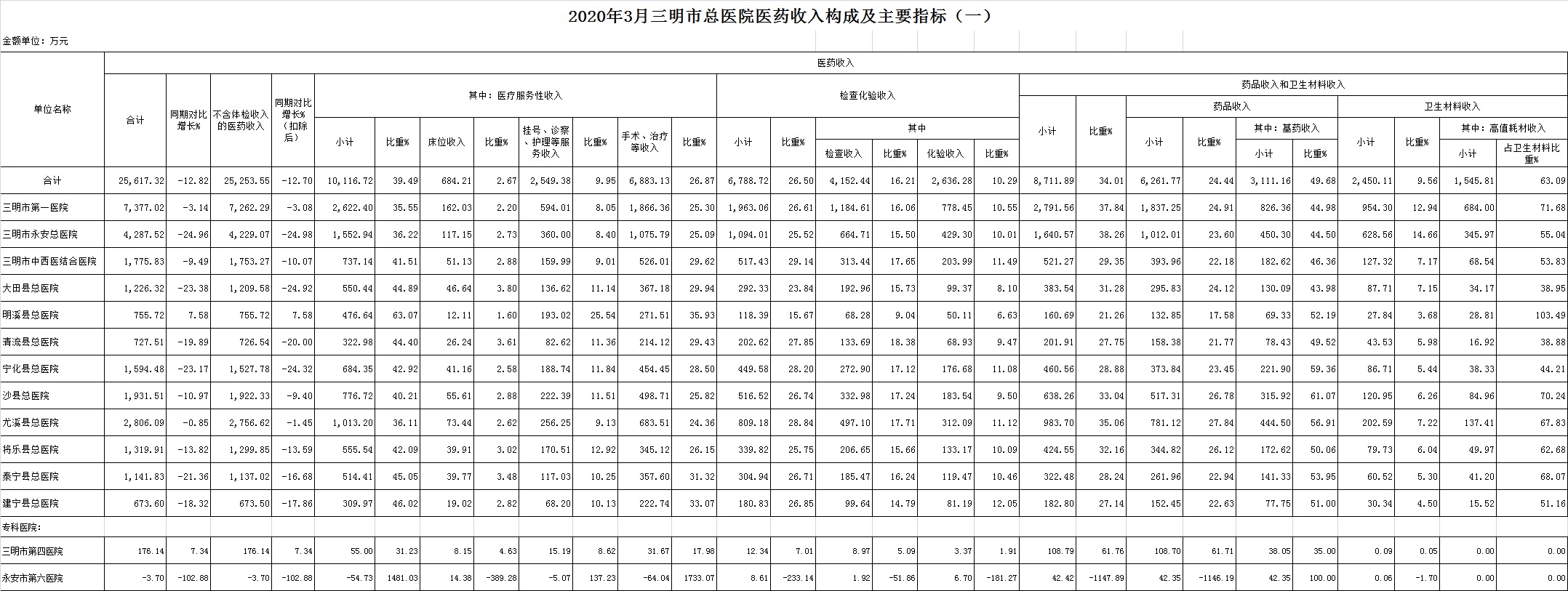 (一)1-3月份12家总医院运行情况:医药总收入64859.85万元,比去年同期82299.32万元,减少17439.46万元,下降21.19%(不含体检收入的医药收入为63907.34万元,比去年同期下降21.15%)。其中:医疗服务性收入25367.50万元,占医药收入39.11%(床位收入1796.32万元、手术治疗护理等服务收入23571.18万元),比去年同期33210.40万元,医疗服务性收入减少7842.90万元,下降23.62%;检查化验收入16849.97万元,同比下降17.96%;药品收入17003.39万元,药占比26.22%,分别比去年同期下降19.19%、增长0.65个百分点;卫生材料收入5638.99万元(其中高值耗材收入3660.00万元),占医药总收入8.69%,比去年同期9.12%,下降0.43个百分点。入院人次61060人次,比去年同期81888人次,减少20828人次,下降25.43%;门急诊人次1321166人次,比去年同期1618256人次,减少297090人次,下降18.36%;每门诊次均费用196.38元,比去年同期187.64元,增加8.74元,增长4.66%;出院者平均费用5967.72元,比去年同期6194.85元,减少227.13元,下降3.67%。