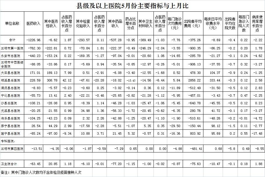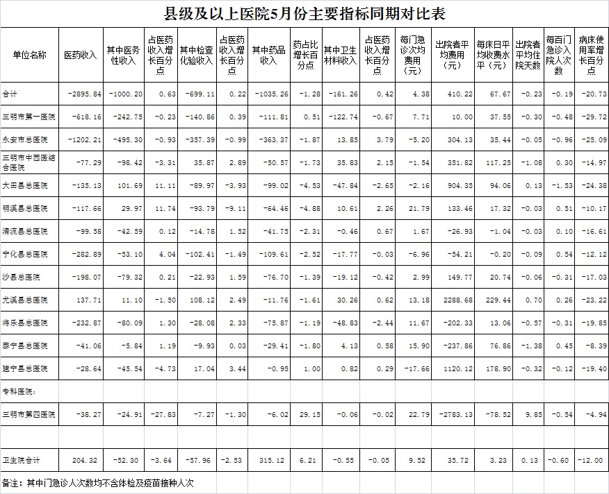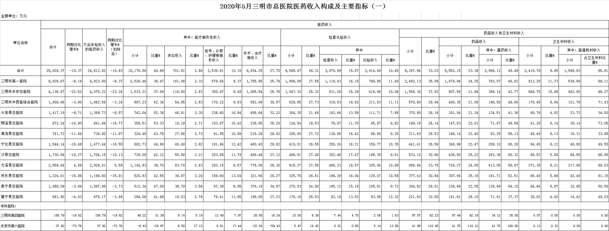 1.医药收入:5月份12家总医院医药总收入25029.37万元,比去年同期27925.21万元,减少2895.84万元,下降10.37%。其中:医疗服务性收入10175.96万元,占医药收入40.66%(床位收入701.91万元、手术治疗护理等服务收入9474.05万元),比去年同期11176.16万元, 医疗服务性收入减少1000.20万元,下降8.95%;药品收入5852.15万元,比去年同期6887.40万元,减少1035.26万元,下降15.03%。