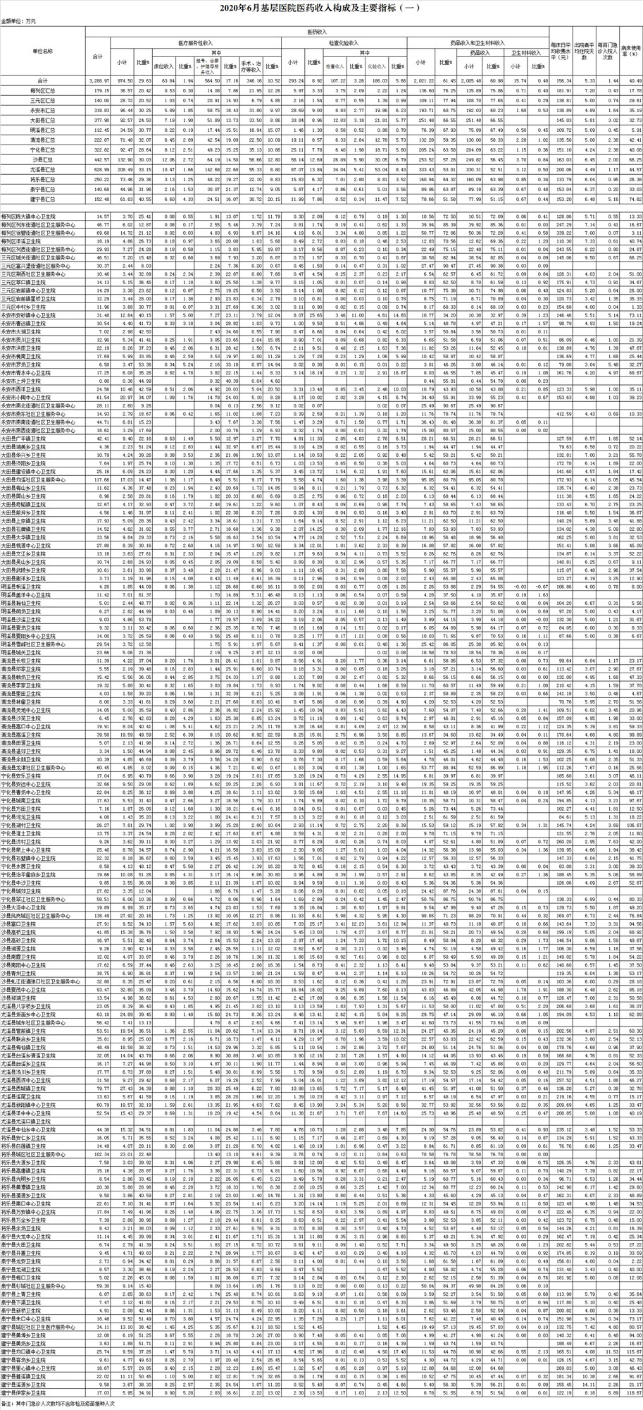 1-6月份基层医疗机构医药总收入19063.56万元(其中村所收入2346.69万元),去年同期18258.78万元,同比增加804.78万元,增长4.41%,其中:医疗服务性收入5452.20万元,占医药收入28.60%(床位收入339.05万元、手术治疗护理等服务收入5113.15万元),去年同期5902.49万元, 医疗服务性收入同比减少450.28万元,下降7.63%;检查化验收入1731.77万元,同比下降18.59%;药品收入11792.06万元,去年同期10133.26万元,同比增加1658.80万元,增长16.37%,药占比61.86%,去年同期55.50%,同比增长6.36个百分点;卫生材料收入87.53万元,较去年同期95.85万元,同比减少8.32万元,占医药收入0.46%,较去年同期0.52%,同比下降0.07个百分点。入院人次38267人次,去年同期54913人次,同比减少16646人次,下降30.31%,其中明溪县、泰宁县、永安市分别下降58.16%、44.70%、39.12%、;门急诊人次2459993人次(其中村所门急诊854318人次),去年同期2355809人次,同比增加104184人次,增长4.42%(基层诊疗量占比为46.38%,较去年同期的41.73%增长4.64个百分点);每门诊次均费用64.87元,去年同期59.34元,同比增加5.52元,增长9.31%;出院者平均费用821.02元,去年同期790.79元,同比增加30.23元,增长3.82%。