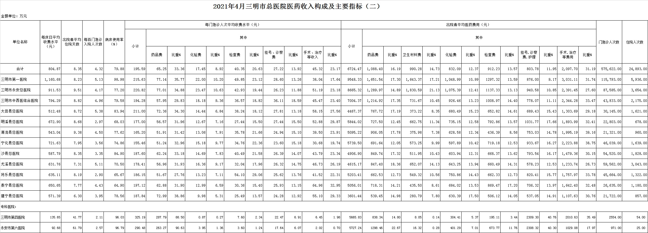 次均费用。4月份12家总医院每门诊次均费用195.59元,比去年同期的200.00元,减少4.41元。出院者平均费用6724.47元,比去年同期6739.88元,减少15.41元。