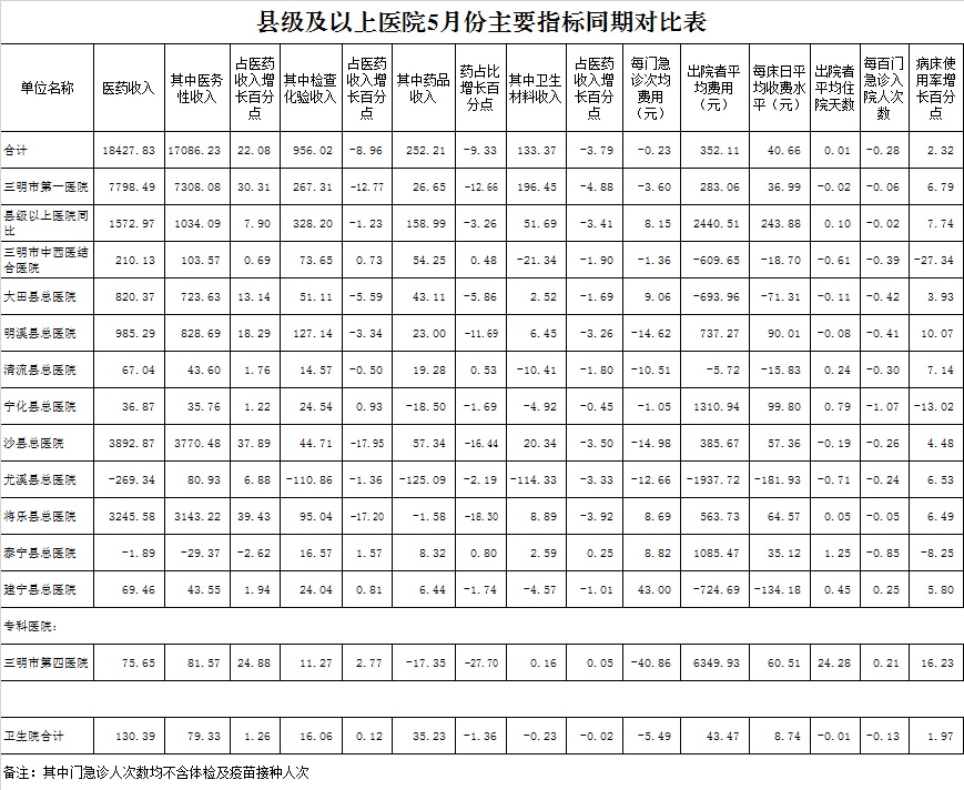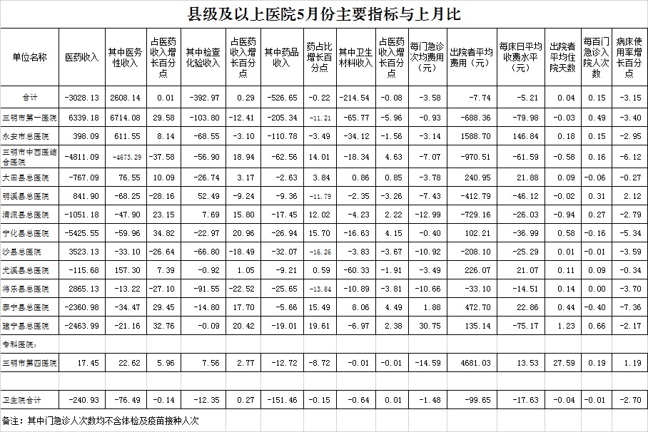 1-5月份基层医疗机构医药总收入17605.76万元(其中村所收入2088.48万元),去年同期15746.85万元,同比增加1858.91万元,增长11.80%,其中:医疗服务性收入4973.56万元,占医药收入28.25%(床位收入297.80万元、手术治疗护理等服务收入4675.76万元),去年同期4477.70万元, 医疗服务性收入同比增加495.86万元,增长11.07%;检查化验收入1893.28万元,同比增长31.61%;药品收入10671.62万元,去年同期9758.84万元,同比增加912.77万元,增长9.35%,药占比60.61%,去年同期61.97%,同比下降1.36个百分点;卫生材料收入67.30万元,较去年同期71.79万元,同比减少4.49万元,占医药收入0.38%,较去年同期0.46%,同比下降0.07个百分点。入院人次32884人次,去年同期31237人次,同比增加1647人次,增长5.27%,其中三元区、明溪县、将乐县分别下降43.38%、25.63%、12.46%;门急诊人次2169551人次(其中村所门急诊767961人次),去年同期1961867人次,同比增加207684人次,增长10.59%(基层诊疗量占比为56.13%,较去年同期的54.19%增长1.94个百分点);每门诊次均费用67.59元,去年同期67.38元,同比增加0.21元,增长0.31%;出院者平均费用902.96元,去年同期807.31元,同比增加95.65元,增长11.85%。