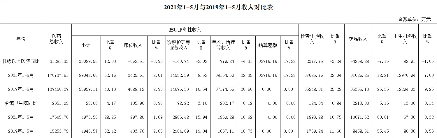 1.医药收入:5月份12家总医院医药总收入43457.20万元,比去年同期25029.37万元,增加18427.83万元,增长73.62%(比2019年同期27925.21万元增加15531.99万元,增长55.62%)。其中:医疗服务性收入27262.19万元,占医药收入62.73%(床位收入710.84万元、手术治疗护理等服务收入11135.15万元、结算差额15416.2万元),比去年同期10175.96万元, 医疗服务性收入增加17086.23万元,增长167.91%;药品收入6104.36万元,比去年同期5852.15万元,增加252.21万元,增长4.31%。