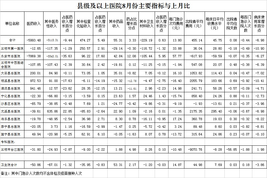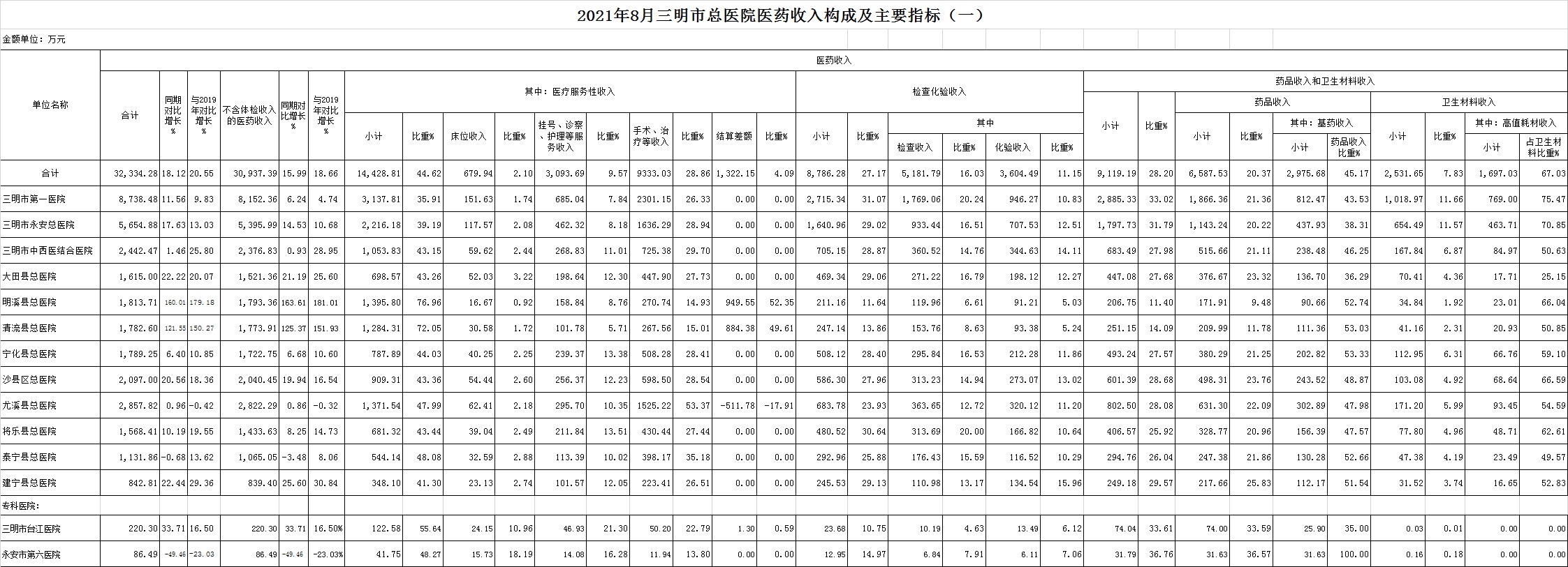 医药总收入。1-8月份12家总医院医药总收入与2019年同比增长37.57%(不含体检收入的医药收入同比增长37.18%),不含医保打包结余的医药总收入与2019年同比增长1.48%,增长率超过考核要求(三级医院考核要求为10%,二级医院考核要求为8%)的有8家总医院,其中市中西医结合医院同比增长17.3%、建宁县总医院同比增长10.21%。