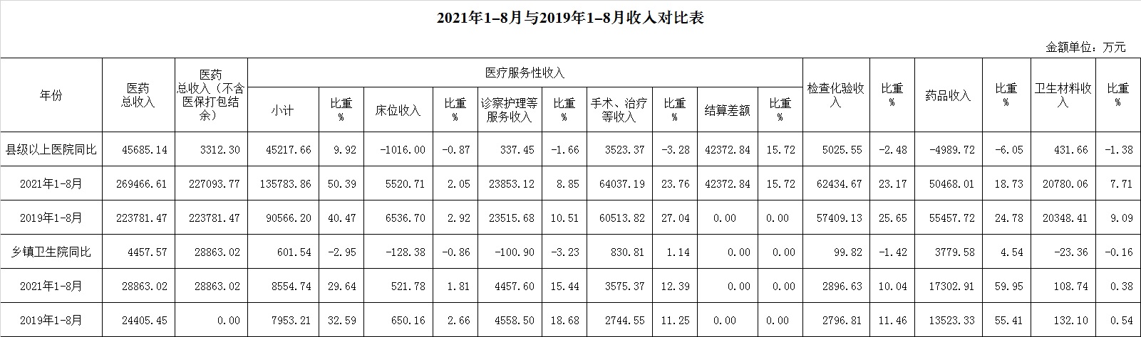 1.医药收入:8月份12家总医院医药总收入32334.28万元,比去年同期27374.46万元,增加4959.82万元,增长18.12%(比2019年同期26823.33万元增加5510.95万元,增长20.55%)。其中:医疗服务性收入14428.81万元,占医药收入44.62%(床位收入679.94万元、手术治疗护理等服务收入12426.72万元、结算差额1322.15万元),比去年同期10968.33万元, 医疗服务性收入增加3460.48万元,增长31.55%;药品收入6587.53万元,比去年同期6168.50万元,增加419.03万元,增长6.79%。