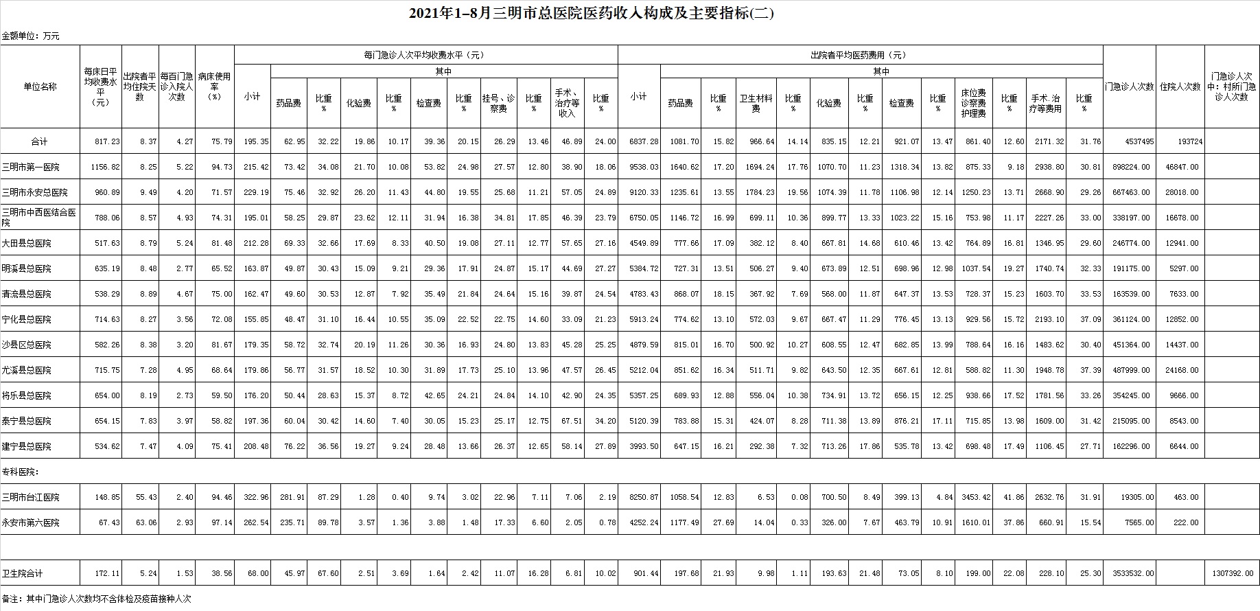 1-8月份基层医疗机构医药总收入28863.02万元(其中村所收入3406.92万元),去年同期25704.51万元,同比增加3158.51万元,增长12.29%,其中:医疗服务性收入8554.74万元,占医药收入29.64%(床位收入521.78万元、手术治疗护理等服务收入8032.96万元),去年同期7390.13万元, 医疗服务性收入同比增加1164.62万元,增长15.76%;检查化验收入2896.63万元,同比增长24.28%;药品收入17302.91万元,去年同期15865.85万元,同比增加1437.05万元,增长9.06%,药占比59.95%,去年同期61.72%,同比下降1.78个百分点;卫生材料收入108.74万元,较去年同期117.73万元,同比减少8.99万元,占医药收入0.38%,较去年同期0.46%,同比下降0.08个百分点。入院人次53924人次,去年同期53127人次,同比增加797人次,增长1.50%,其中三元区、明溪县、大田县分别下降28.09%、25.64%、13.9%;门急诊人次3533532人次(其中村所门急诊1307392人次),去年同期3246578人次,同比增加286954人次,增长8.84%(基层诊疗量占比为43.78%,较去年同期的45.21%降低1.43个百分点);每门诊次均费用68.00元,去年同期65.97元,同比增加2.03元,增长3.07%;出院者平均费用901.44元,去年同期805.16元,同比增加96.28元,增长11.96%。