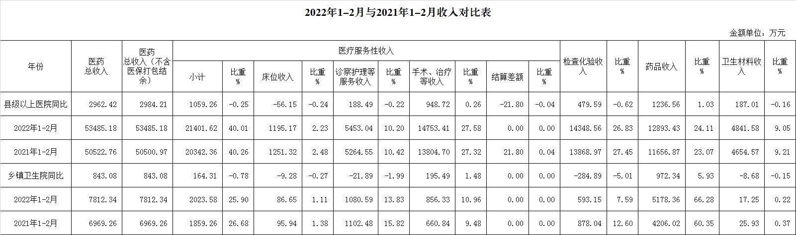 1.医药收入:2月份12家总医院医药总收入23912.82万元,比去年同期22624.07万元,增加1288.74万元,增长5.70%。其中:医疗服务性收入9568.92万元,占医药收入40.02%(床位收入543.47万元、手术治疗护理等服务收入9025.45万元),比去年同期9125.02万元, 医疗服务性收入增加443.90万元,增长4.86%;药品收入5462.29万元,比去年同期5215.97万元,增加246.32万元,增长4.72%。