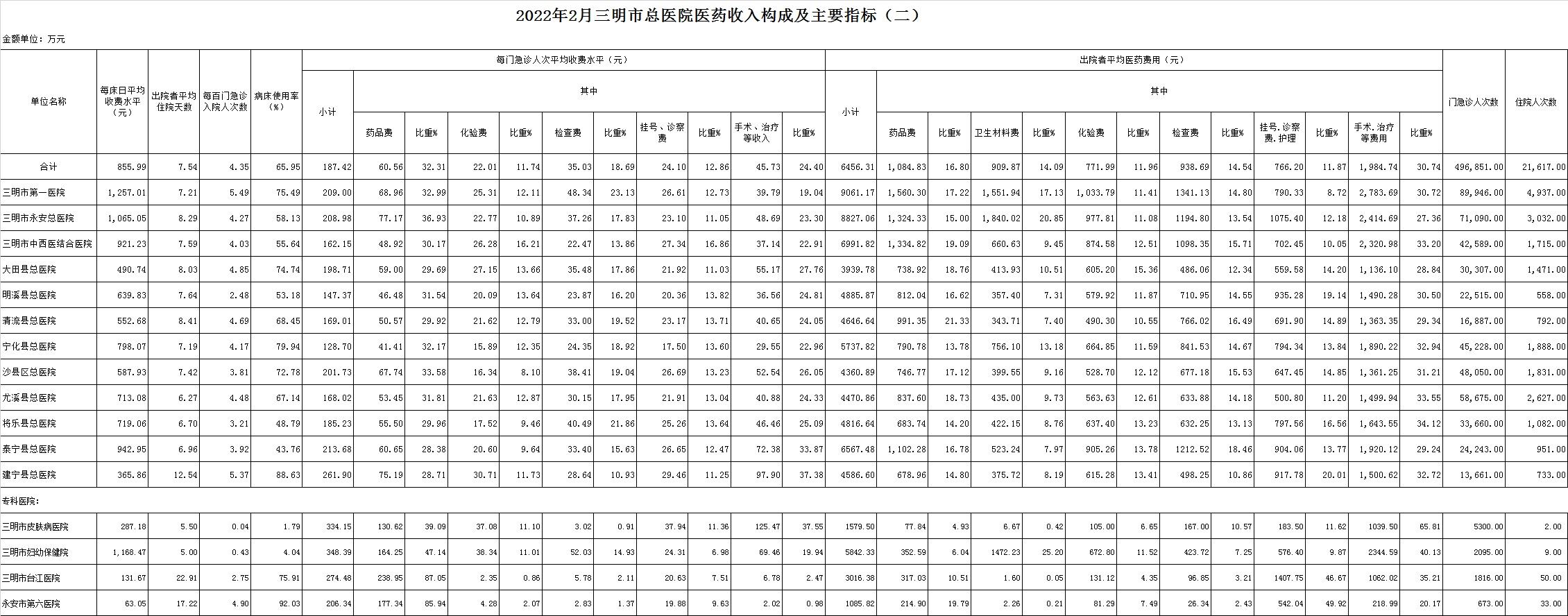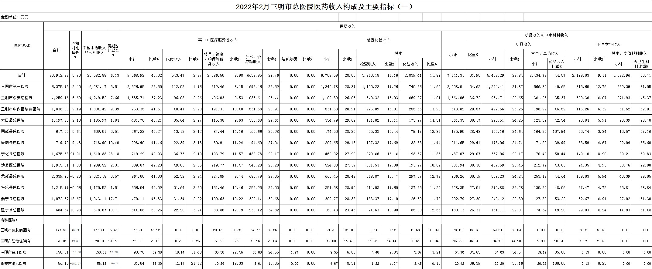 医药总收入。1-2月份12家总医院医药总收入同比增长5.86%(不含体检收入的医药收入同比增长6.26%),增长率超过考核要求(三级医院考核要求为10%,二级医院考核要求为8%)的有5家总医院,其中建宁县总医院同比增长30.47%、泰宁县县总医院同比增长16.72%、清流县总医院同比增长15.31%。