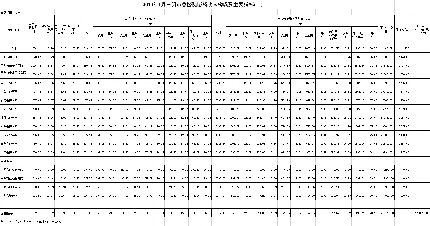 1月份基层医疗机构医药总收入3785.75万元(其中村所收入508.41万元),去年同期4294.58万元,同比减少508.83万元,下降11.85%,其中:医疗服务性收入906.31万元,占医药收入23.94%(床位收入41.39万元、手术治疗护理等服务收入864.91万元),去年同期1095.73万元, 医疗服务性收入同比减少189.42万元,下降17.29%;检查化验收入264.45万元,同比下降2.86%;药品收入2602.43万元,去年同期2917.64万元,同比减少315.21万元,下降10.80%,药占比68.74%,去年同期67.94%,同比增长0.81个百分点;卫生材料收入12.57万元,较去年同期8.99万元,同比增加3.58万元,占医药收入0.33%,较去年同期0.21%,同比增长0.12个百分点。入院人次4539人次,去年同期5124人次,同比减少585人次,下降11.42%,其中三元区南部、宁化县、明溪县分别下降80%、65.91%、41.45%;门急诊人次472177人次(其中村所门急诊179891人次),去年同期466354人次,同比增加5823人次,增长1.25%(基层诊疗量占比为52.24%,较去年同期的41.93%增长10.31个百分点);每门诊次均费用71.85元,去年同期82.60元,同比减少10.74元,下降13.01%;出院者平均费用917.49元,去年同期826.61元,同比增加90.88元,增长10.99%。