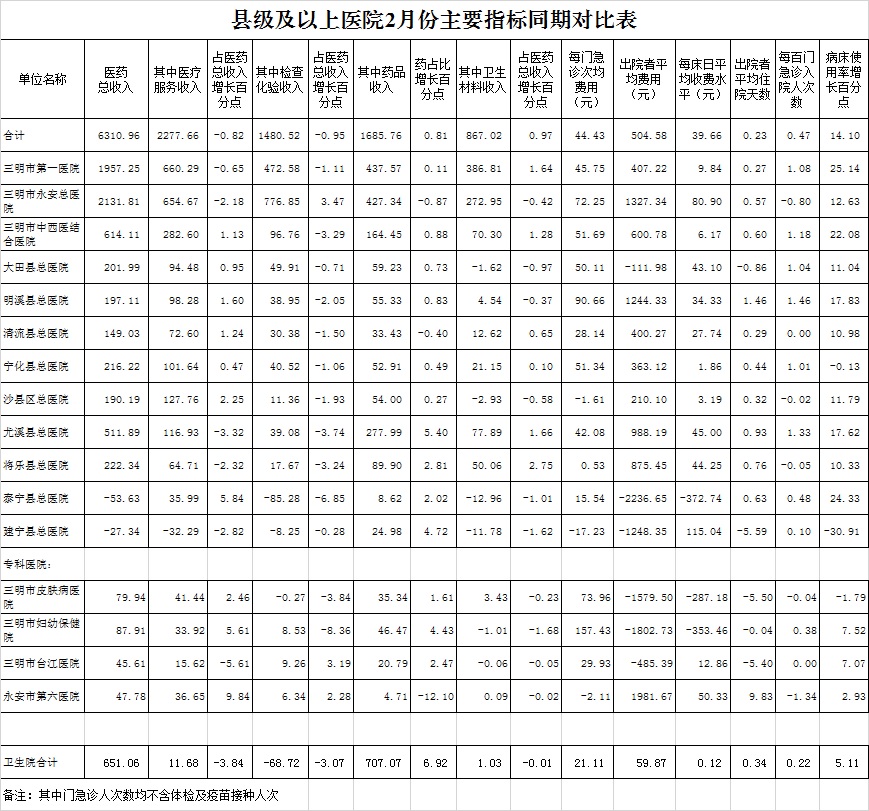 1.医药收入:2月份12家总医院医药总收入30223.78万元,比去年同期23912.82万元,增加6310.96万元,增长26.39%。其中:医疗服务性收入11846.58万元,占医药收入39.20%(床位收入653.97万元、手术治疗护理等服务收入11192.60万元),比去年同期9568.92万元, 医疗服务性收入增加2277.66万元,增长23.80%;药品收入7148.05万元,比去年同期5462.29万元,增加1685.76万元,增长30.86%。