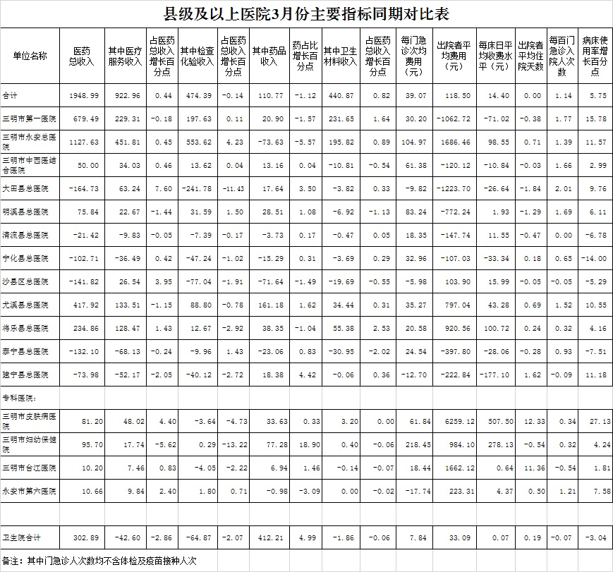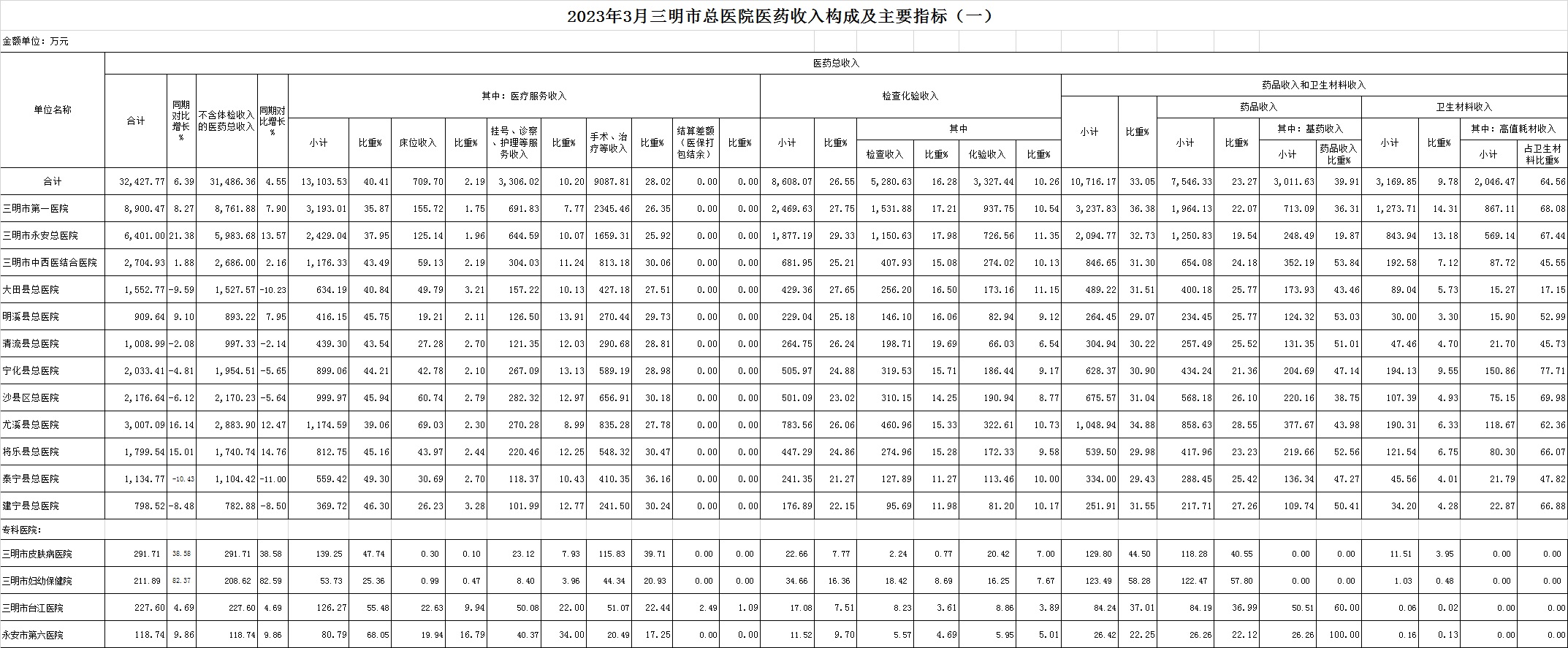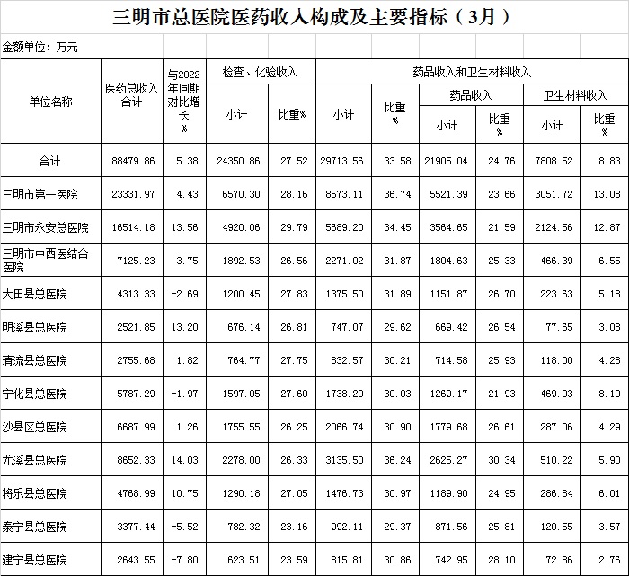 医药总收入。1-3月份12家总医院医药总收入同比增长5.38%(不含体检收入的医药收入同比增长4.41%),增长率超过考核要求(三级医院考核要求为10%,二级医院考核要求为8%)的有3家总医院,其中尤溪县总医院同比增长12.96%、明溪县总医院同比增长12.91%、将乐县总医院同比增长9.71%。