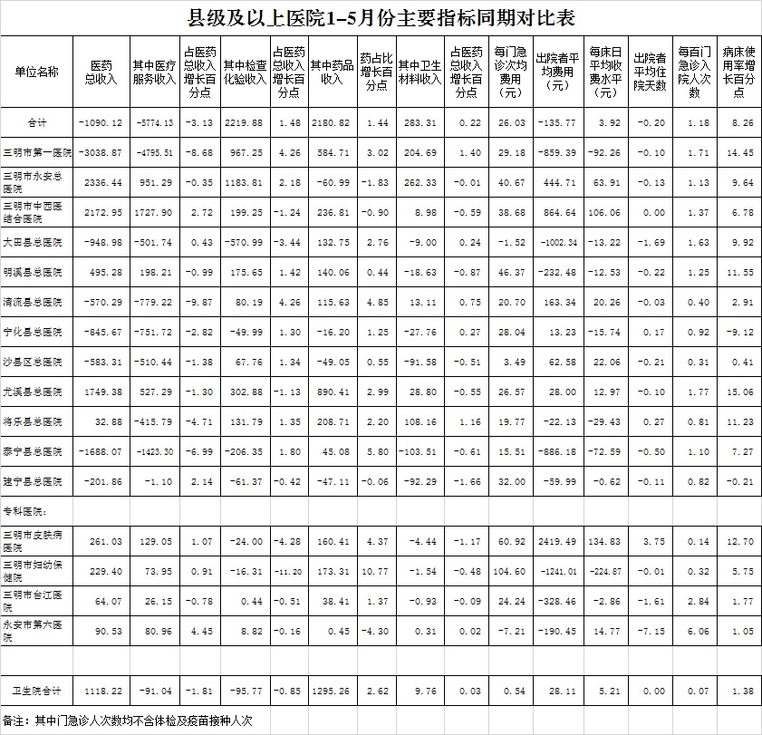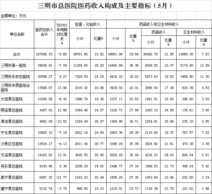 医药总收入。1-5月份12家总医院医药总收入同比下降0.65%(不含体检收入的医药收入同比下降1.29%),增长率超过考核要求(三级医院考核要求为10%,二级医院考核要求为8%)的有3家总医院,其中市中西医结合医院同比增长13.9%、尤溪县总医院同比增长13.91%、明溪县总医院同比增长12.66%。