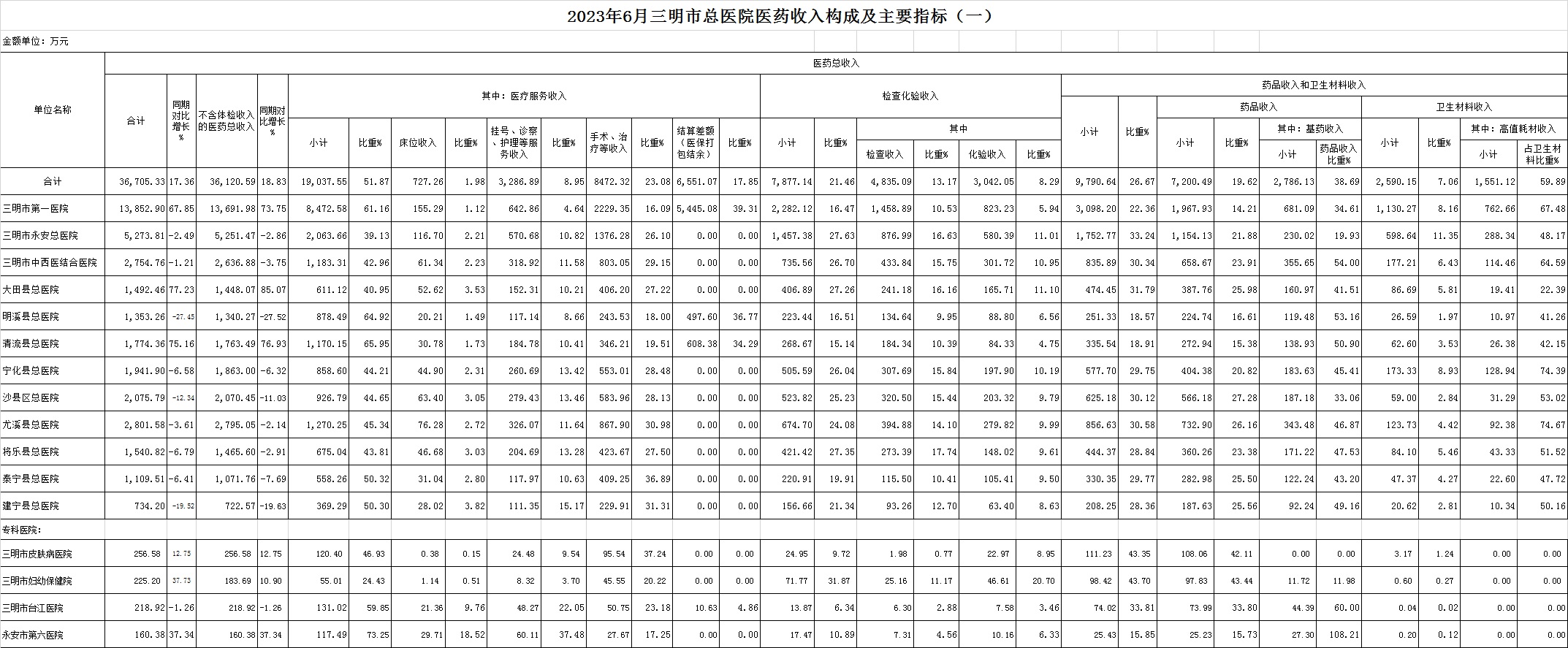 永安总医院44.05%、市中西医结合医院57.65%、大田县总医院55.86%、明溪县总医院51.86%、清流县总医院49.01%、宁化县总医院48.79%、沙县总医院53.88%、尤溪县总医院40.46%、将乐县总医院48.1%、泰宁县总医院51.92%、建宁县总医院56.2%,仅尤溪县总医院未完成考核指标。