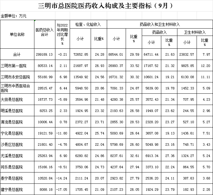 医药总收入。1-9月份12家总医院医药总收入同比下降0.21%,不含体检、疫苗接种和结算差额等收入的医药收入同比增长2.61%,增长率超过考核要求(三级医院考核要求为10%,二级医院考核要求为8%)的有2家总医院,其中清流县总医院同比增长9.72%、明溪县总医院同比增长9.1%。