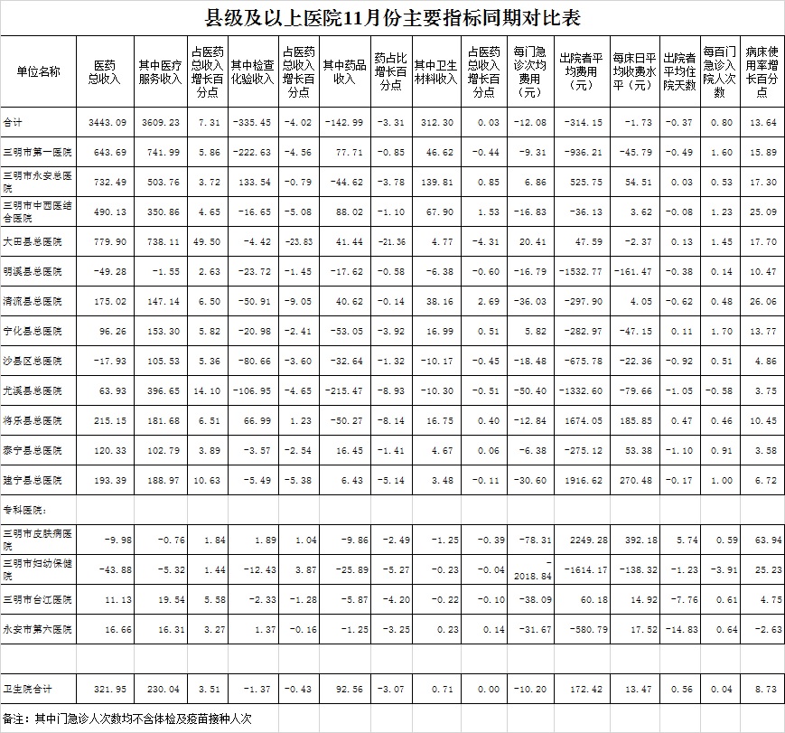 1.医药收入:11月份12家总医院医药总收入31496.05万元,比去年同期28052.96万元,增加3443.09万元,增长12.27%。其中:医疗服务性收入14266.90万元,占医药收入45.30%(床位收入948.57万元、手术治疗护理等服务收入13018.33万元、结算差额300万元),比去年同期10657.67万元, 医疗服务性收入增加3609.23万元,增长33.87%;药品收入7187.48万元,比去年同期7330.47万元,减少142.99万元,下降1.95%。