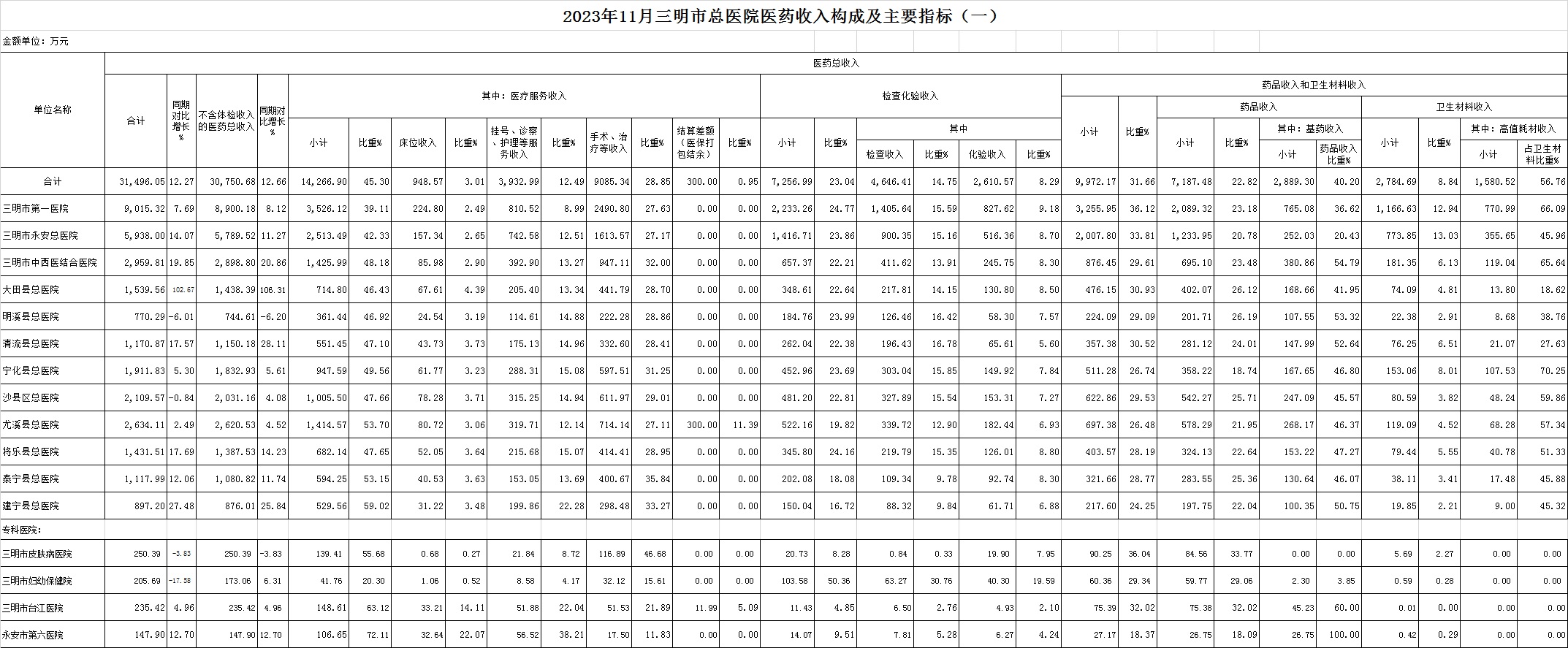 (一)1-11月份12家总医院运行情况:医药总收入361174.56万元,比去年同期359130.64万元增加2043.92万元,增长0.57%(不含体检、疫苗接种和结算差额等收入的医药收入为305152.66万元,比去年同期295444.82万元增加9707.84万元,增长3.29%)。其中:医疗服务性收入165915.76万元,占医药收入45.94%(床位收入8151.48万元、手术治疗护理等服务收入129449.37万元、结算差额28314.91万元),比去年同期167663.07万元,医疗服务性收入减少1747.31万元,下降1.04%(不含结算差额的医疗服务性收入137600.85万元,占医药收入41.34%,比去年同期127031.75万元增加10569.1万元增长7.68%);检查化验收入87360.55万元,占医药收入24.19%,同比增长2.93%;药品收入78706.36万元,药占比21.79%,分别比去年同期增长0.45%、下降0.03个百分点;卫生材料收入29191.89万元(其中高值耗材收入17433.44万元),占医药总收入8.08%,比去年同期7.86%,增长0.22个百分点。入院人次297569人次,比去年同期257368人次,增加40201人次,增长15.62%;门急诊人次6017073人次,比去年同期6662675人次,减少645602人次,下降9.69%;每门诊次均费用211.88元,比去年同期196.61元,增加15.27元,增长7.76%;出院者平均费用6554.54元,比去年同期6922.57元,减少368.02元,下降5.32%。