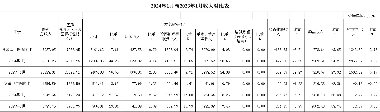 1月份基层医疗机构医药总收入5142.34万元(其中村所收入618.69万元),去年同期3785.75万元,同比增加1356.59万元,增长35.83%,其中:医疗服务性收入1417.72万元,占医药收入27.57%(床位收入119.39万元、手术治疗护理等服务收入1298.33万元),去年同期906.31万元, 医疗服务性收入同比增加511.41万元,增长56.43%;检查化验收入293.47万元,同比增长10.98%;药品收入3418.70万元,去年同期2602.43万元,同比增加816.28万元,增长31.37%,药占比66.48%,去年同期68.74%,同比下降2.26个百分点;卫生材料收入12.44万元,较去年同期12.57万元,同比减少0.13万元,占医药收入0.24%,较去年同期0.33%,同比下降0.09个百分点。入院人次7646人次,去年同期4539人次,同比增加3107人次,增长68.45%;门急诊人次562281人次(其中村所门急诊196785人次),去年同期472177人次,同比增加90104人次,增长19.08%(基层诊疗量占比为47.78%,较去年同期的52.24%下降4.46个百分点);每门诊次均费用77.38元,去年同期71.85元,同比增加5.53元,增长7.69%;出院者平均费用1036.50元,去年同期917.49元,同比增加119.01元,增长12.97%。