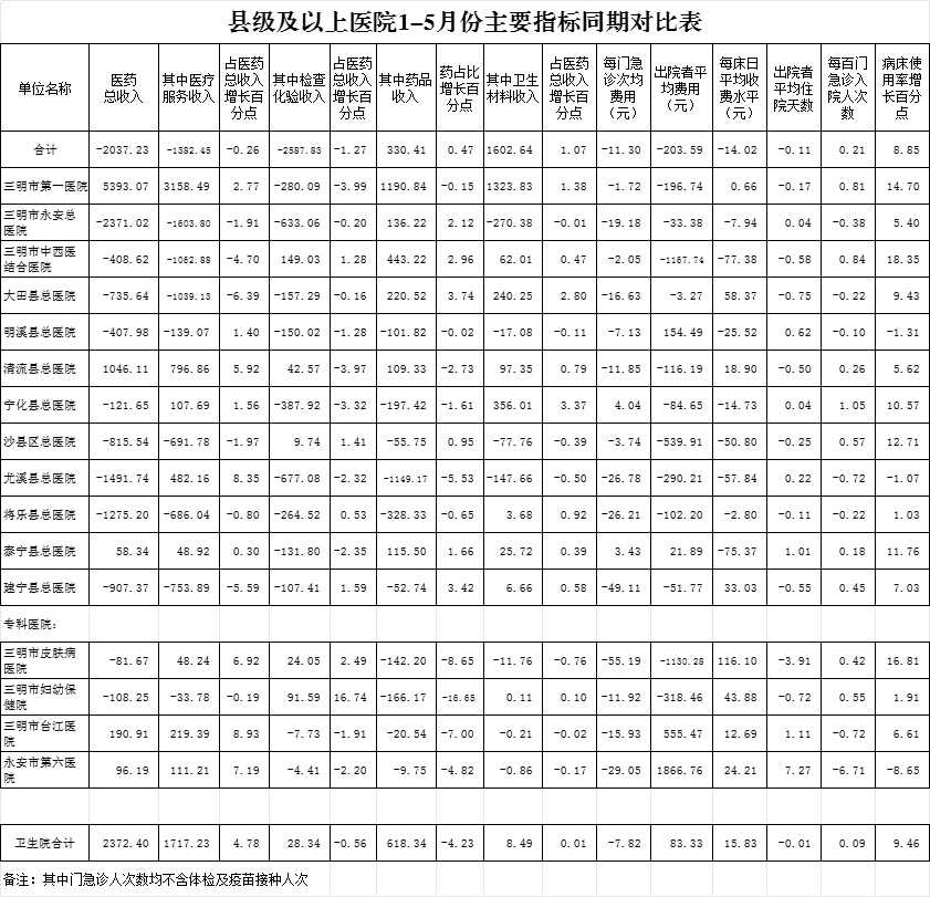 医药总收入。1-5月份12家总医院医药总收入同比下降1.22%(不含体检收入的医药收入同比下降1.16%),增长率超过考核要求(三级医院考核要求为10%,二级医院考核要求为8%)的有3家总医院,其中市中西医结合医院同比增长19.65%、清流县总医院同比增长15.51%、市第一医院同比增长14.25%。